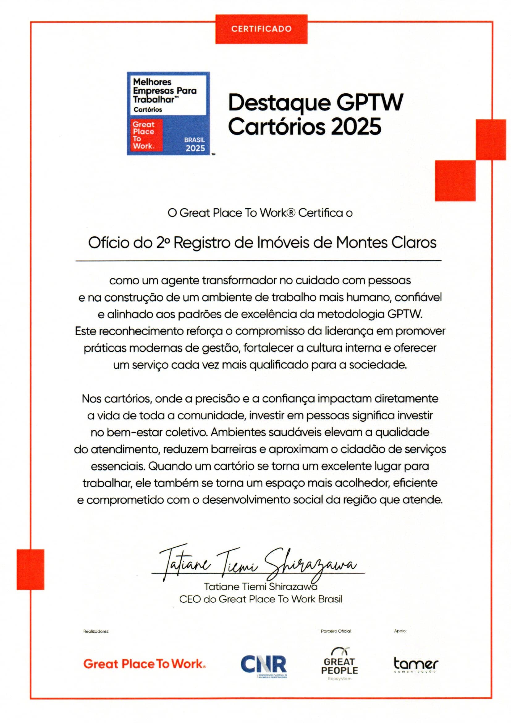 - Certificado de Great Place to Work (Melhores Empresas para Trabalhar), obtido em 2023, a oitava colocação na categoria ouro em 2024 e 18º lugar a nível Minas Gerais, na categoria Pequenas Empresas; e reconhecido em 2025 como uma das Melhores Empresas para Trabalhar na categoria Cartórios.