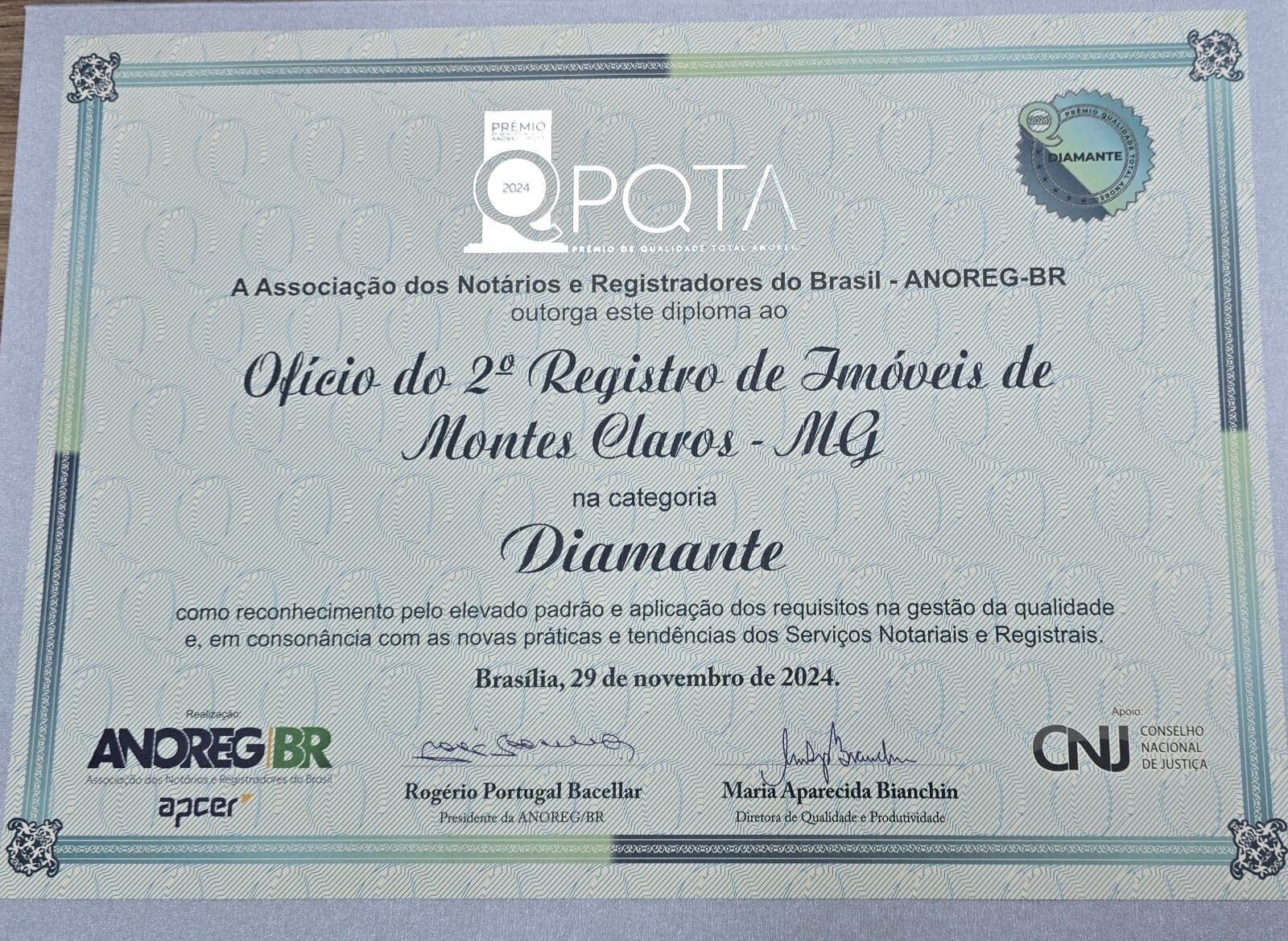 O Prêmio de Qualidade Total da Anoreg/BR (PQTA) é um reconhecimento da Associação de Notários e Registradores do Brasil (Anoreg/BR) aos cartórios que implantam critérios de excelência de gestão e se submetem às auditorias. O cartório passou por auditorias para concorrer ao Prêmio nos anos de 2014 a 2017, 2019 a 2021, pontuação necessária dos itens auditados e conquistando, desta forma, a conformidade para a premiação Diamante, maior reconhecimento da categoria.