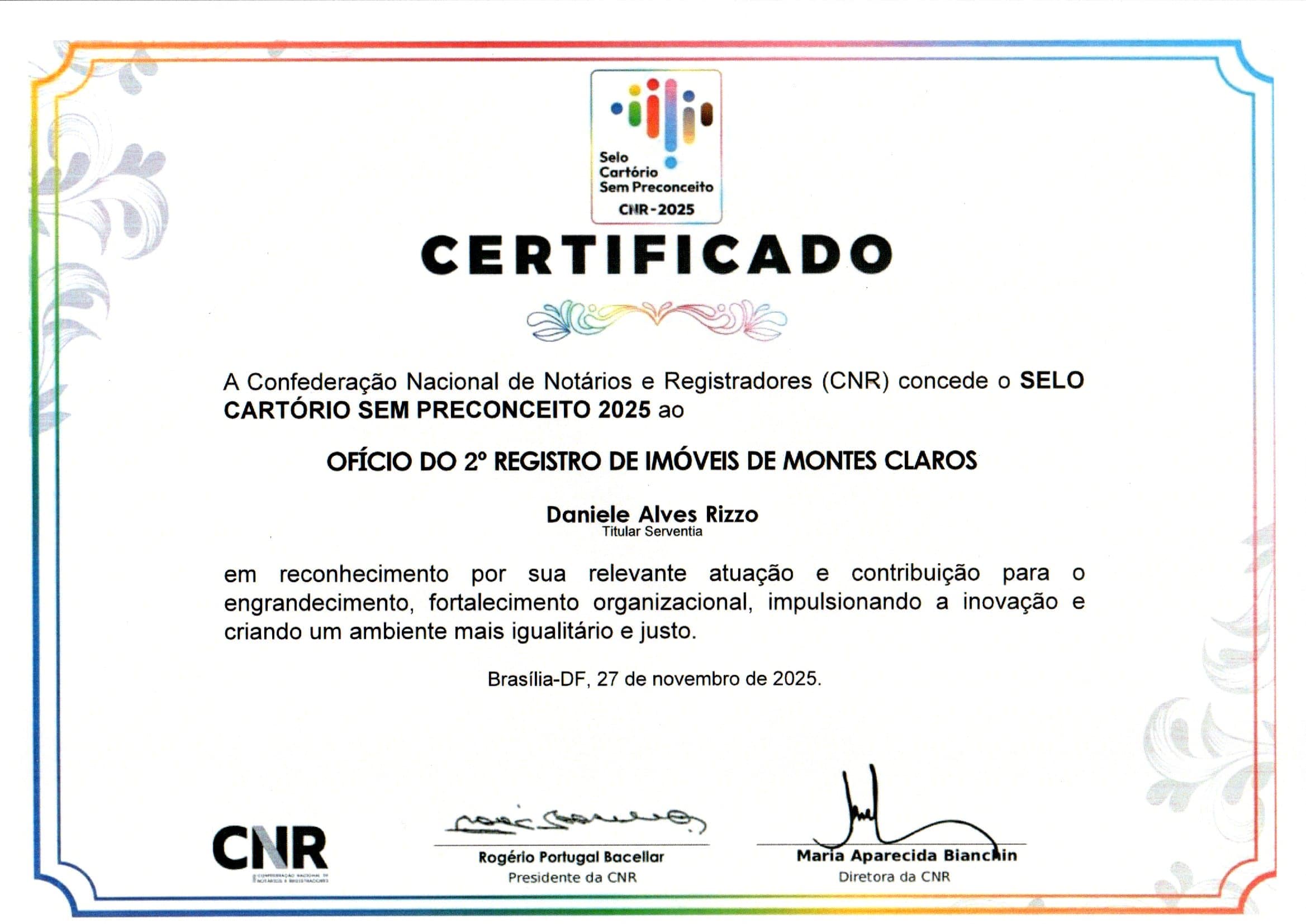- Selo Cartório Sem Preconceito, destinado às serventias que desenvolvem políticas internas de respeito, diversidade, igualdade de tratamento e combate a qualquer forma de discriminação, obtido em 2025.