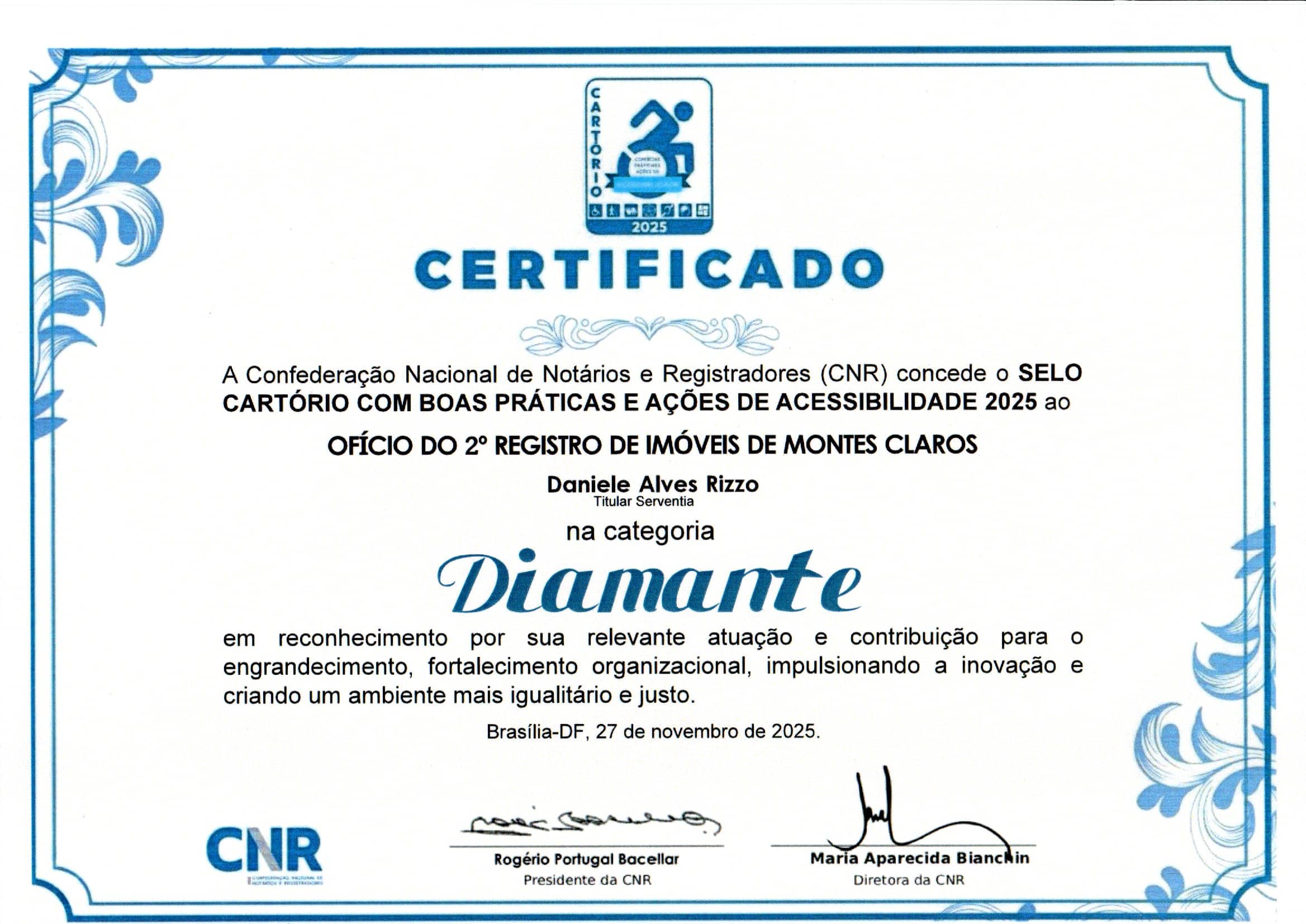 - Certificado de Responsabilidade Socioambiental pelo Colégio Notarial do Brasil, obtido em 2016.