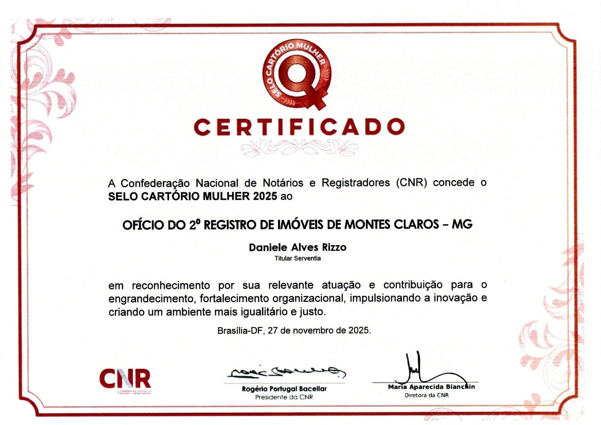 - Selo Cartório Mulher, concedido às serventias que promovem ações institucionais de valorização, proteção e equidade para mulheres, com diretrizes preventivas e práticas de acolhimento, obtido em 2025.
